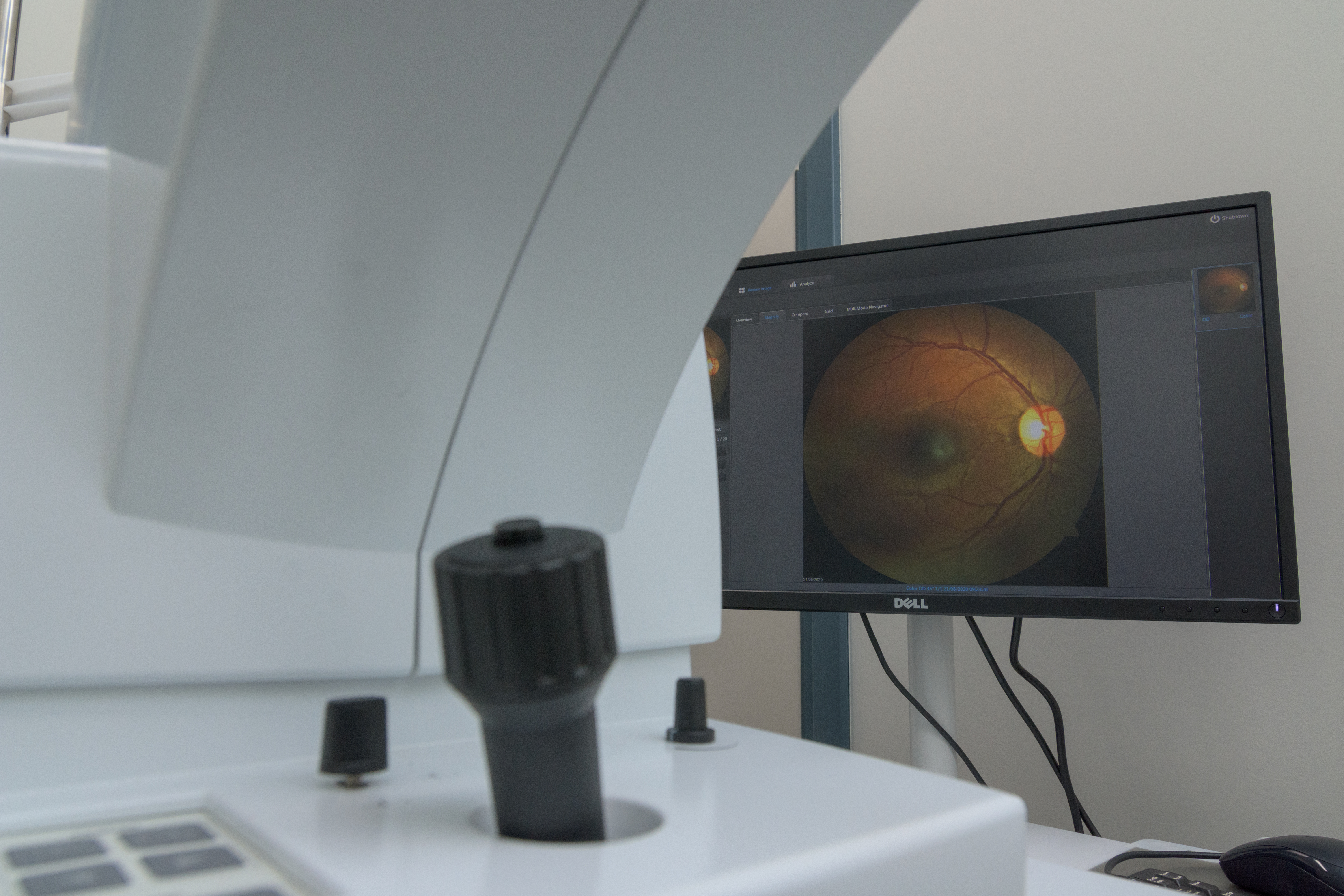 A camera that takes a picture of the retina (back of the eye). It gives a visualization of the optic nerve, macula and blood vessels to help monitor for certain eye diseases. A good tool to have in order to educate patients on their eye health.